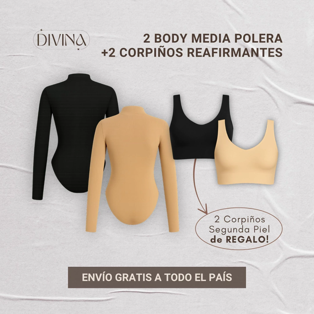 Con nuestro pack de 2 bodys media polera + 2 corpiños reafirmantes segunda piel de regalo vas a lograr una silueta más prolija, estilizada y sin marcas.