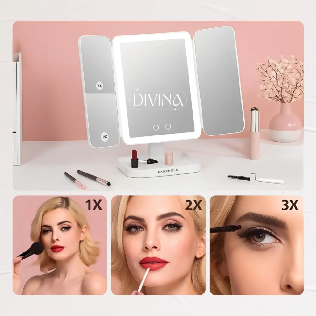 | Espejos | Triple panel plegable | Ves todos los ángulos simultáneamente |