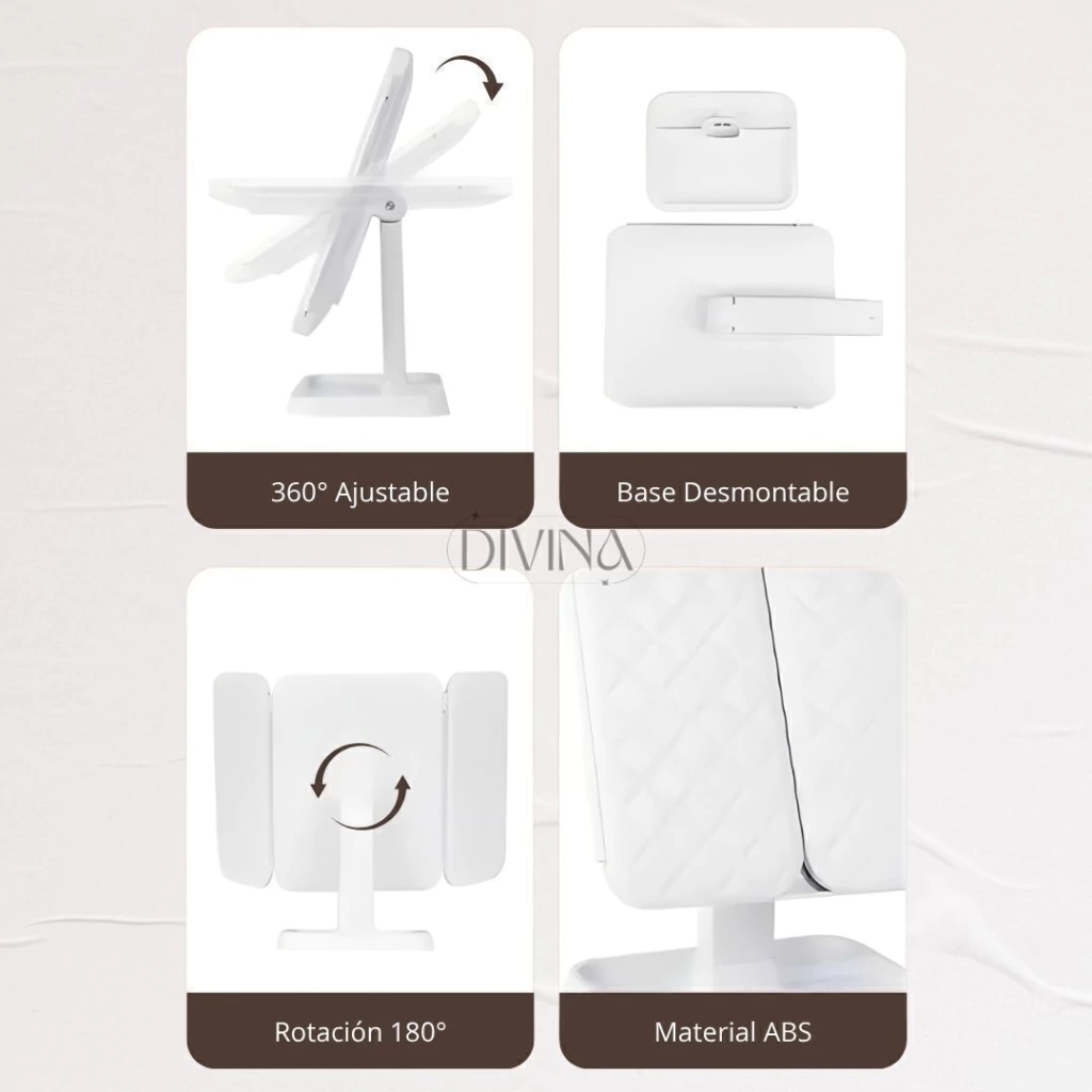 Triple panel que se pliega completamente. Perfecto para viajar sin ocupar lugar.